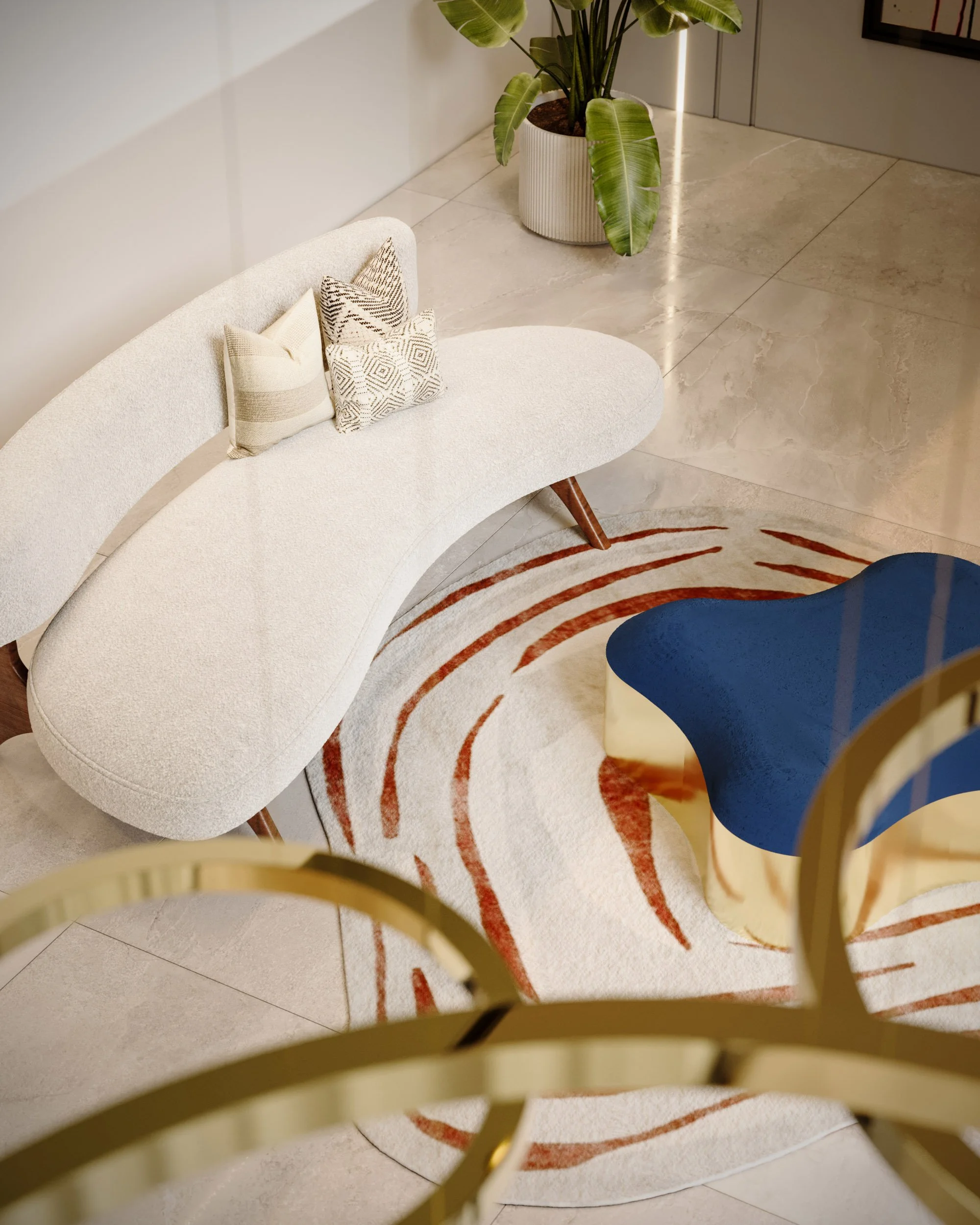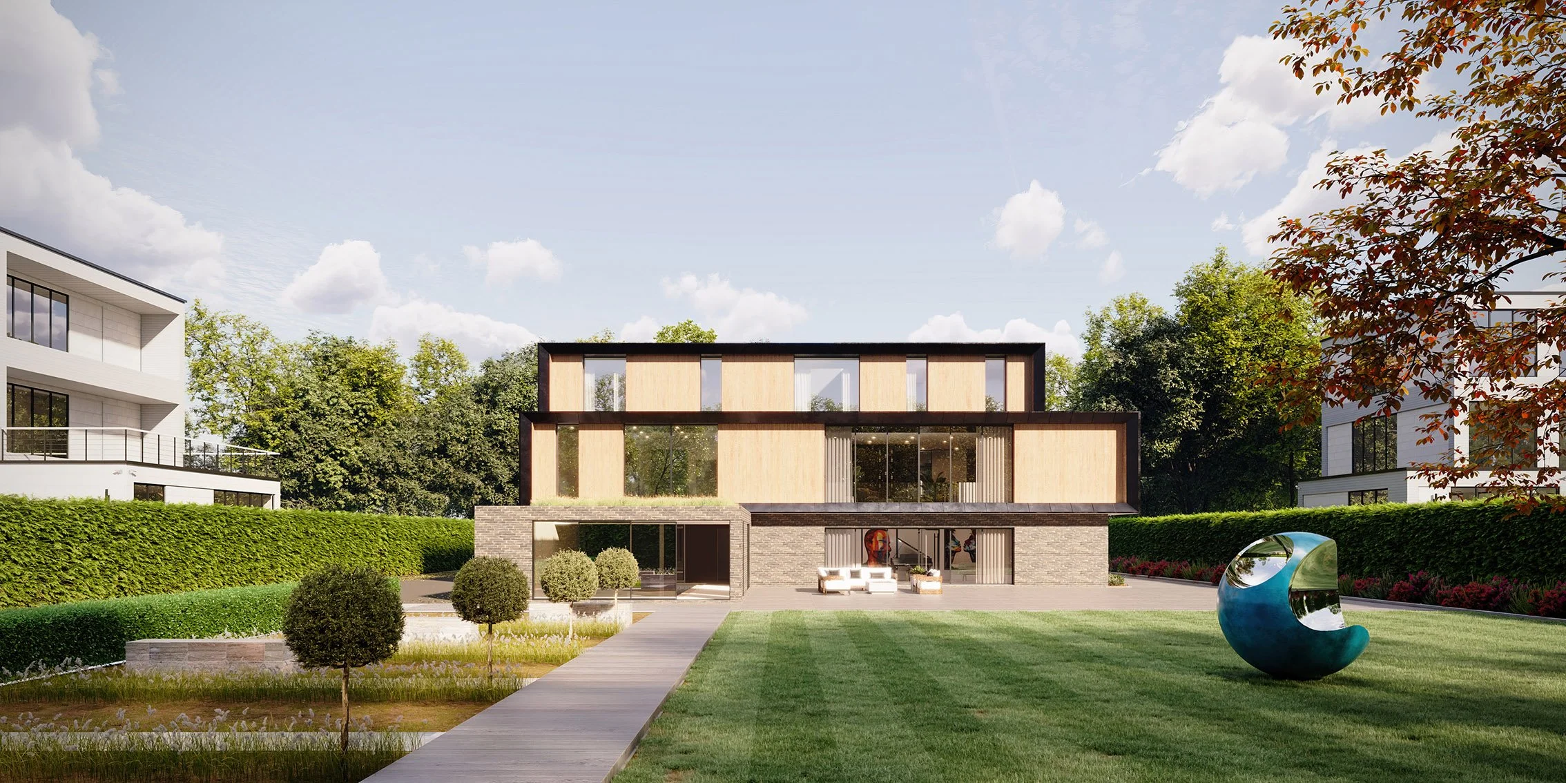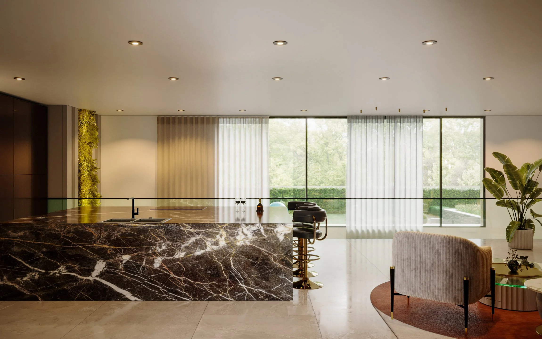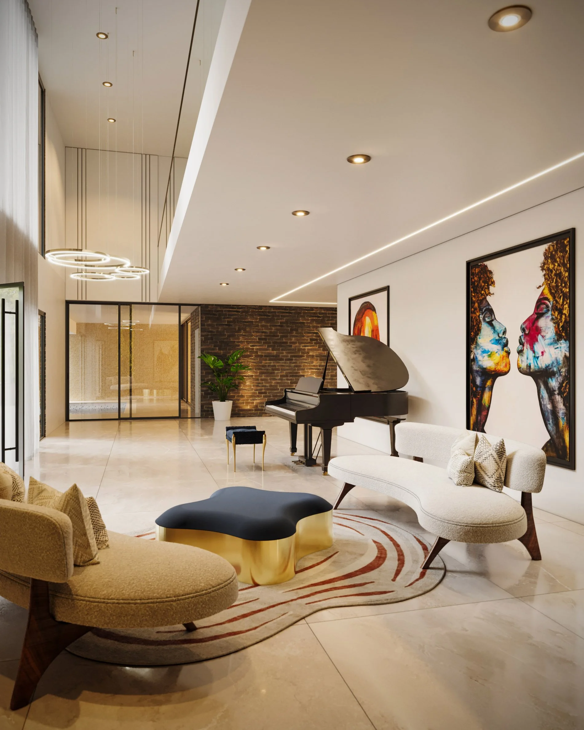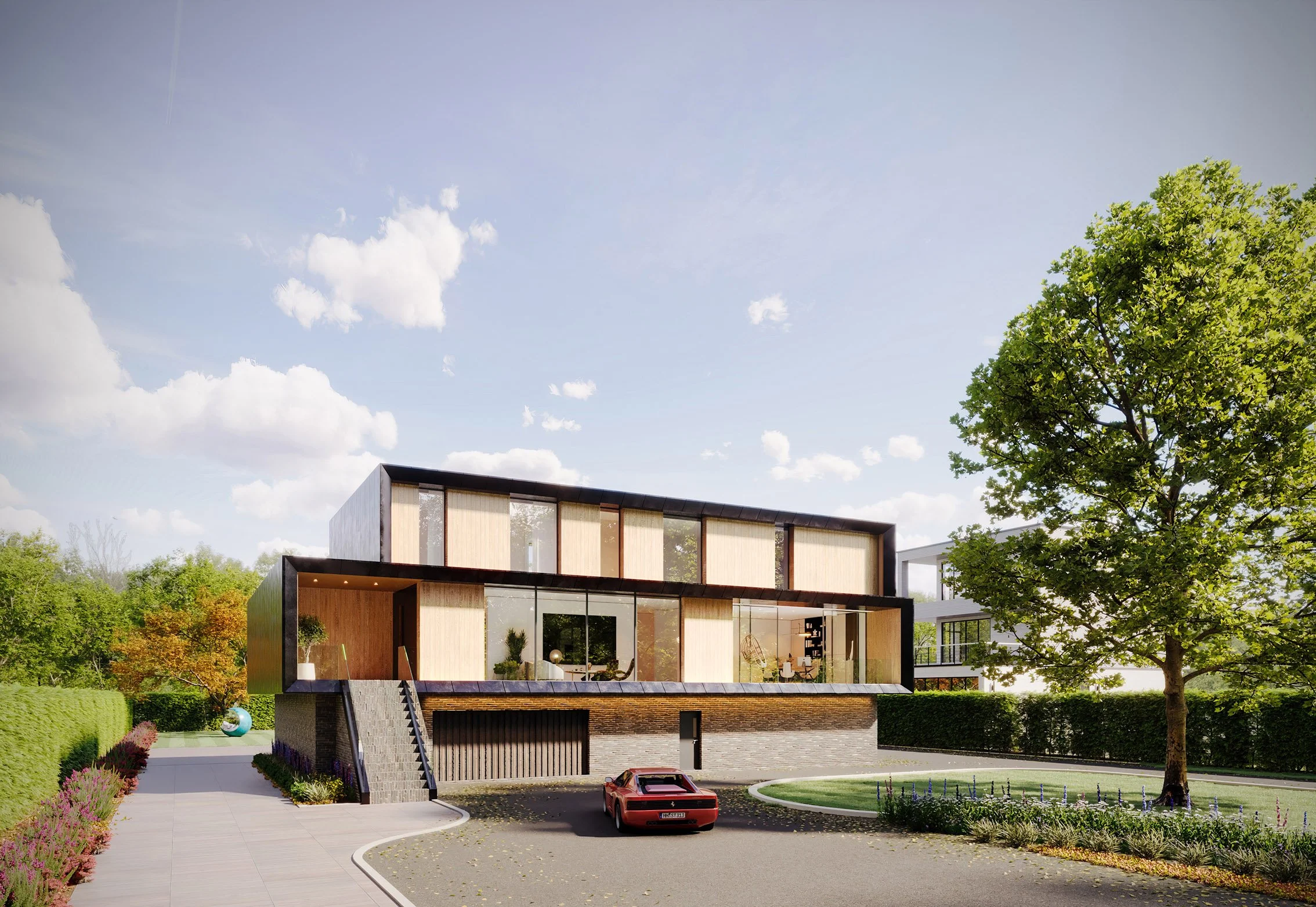 Our client, having lived in the States, developed a fondness for American modernism, which inspired our design concept centred on elevated living. The pool, gym, and wellness spaces are located on the ground level to create a strong physical connection to the garden and outdoor areas. Access to the main entrance is via a recessed, stepped pathway leading to the first floor, where the primary living, kitchen, and entertainment spaces are situated, along with a home office featuring a front-facing balcony. A double-height space links the lounge with the downstairs music room, incorporating expansive curtain walling that enhances the visual connection to the garden. The second floor accommodates four generously sized bedrooms.