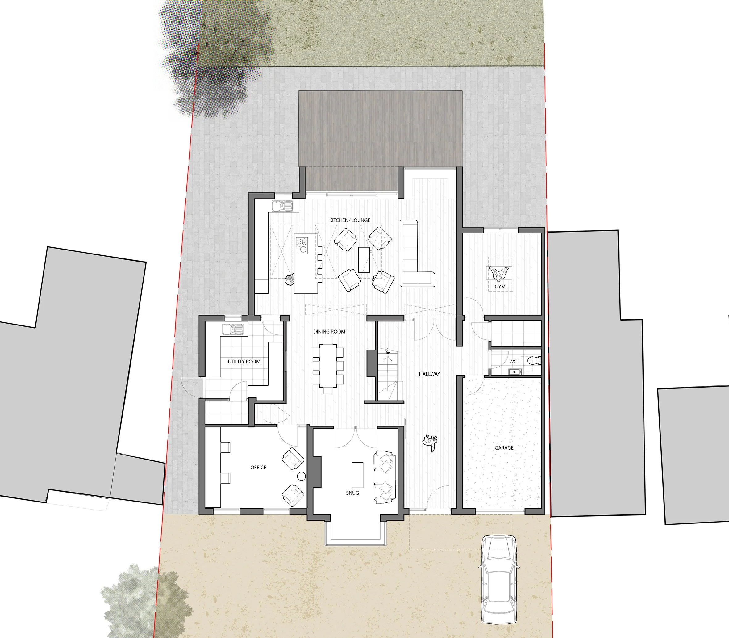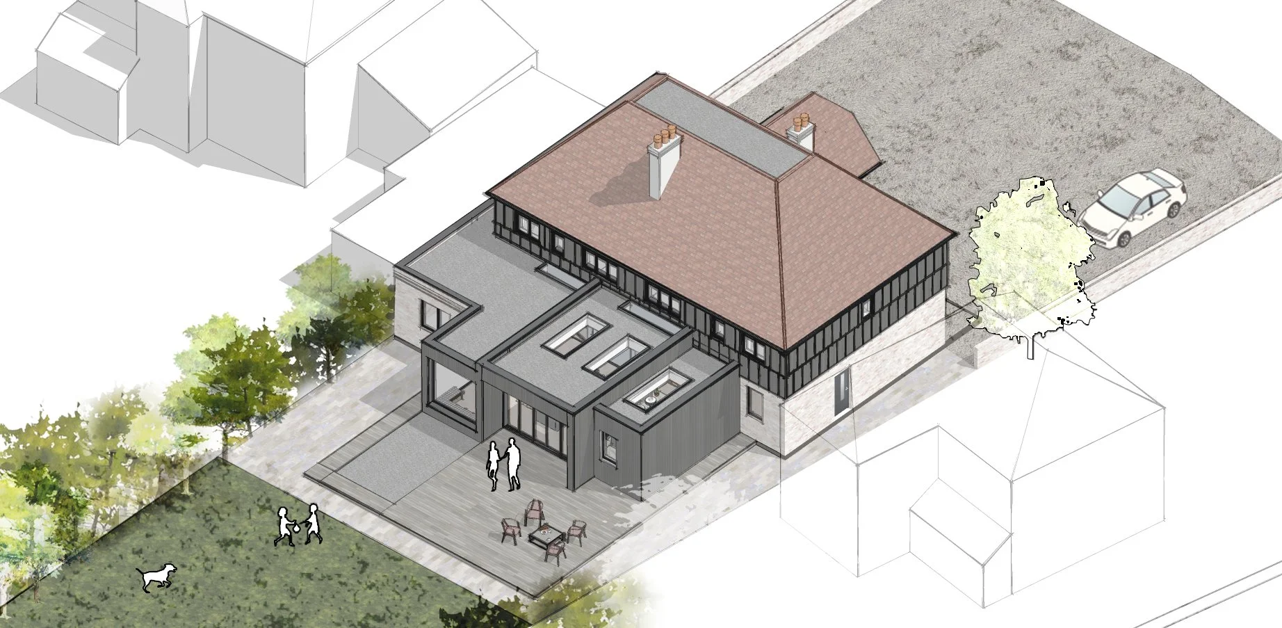 Located in the green belt on the edge of Epsom Downs, Surrey, the existing property, constructed in the 1920’s, was purchased by a young family and was in serious need of major renovation to create a new character and reconfigure it for modern living. The existing three bedrooms were inadequately proportioned. The family needed a fourth one, each large enough to accommodate a double bed and workspace, with an ensuite and dresser in the master bedroom.
