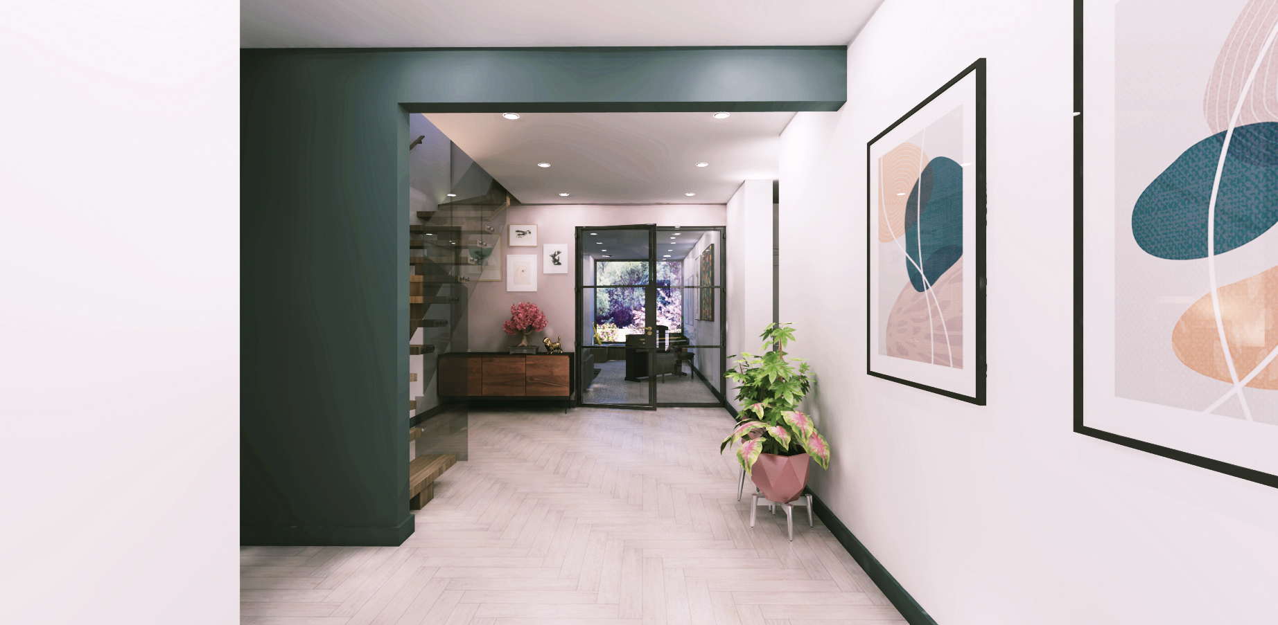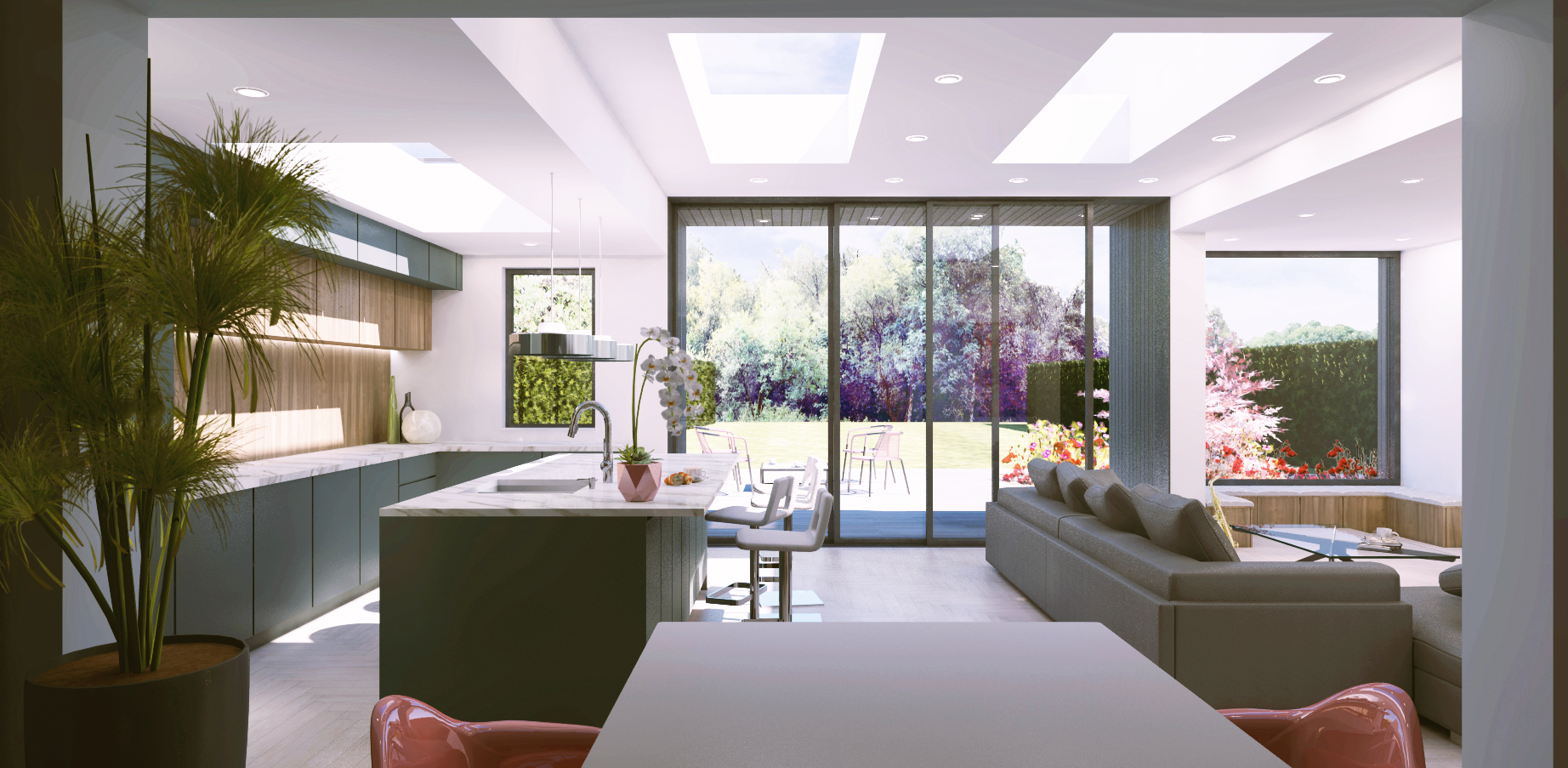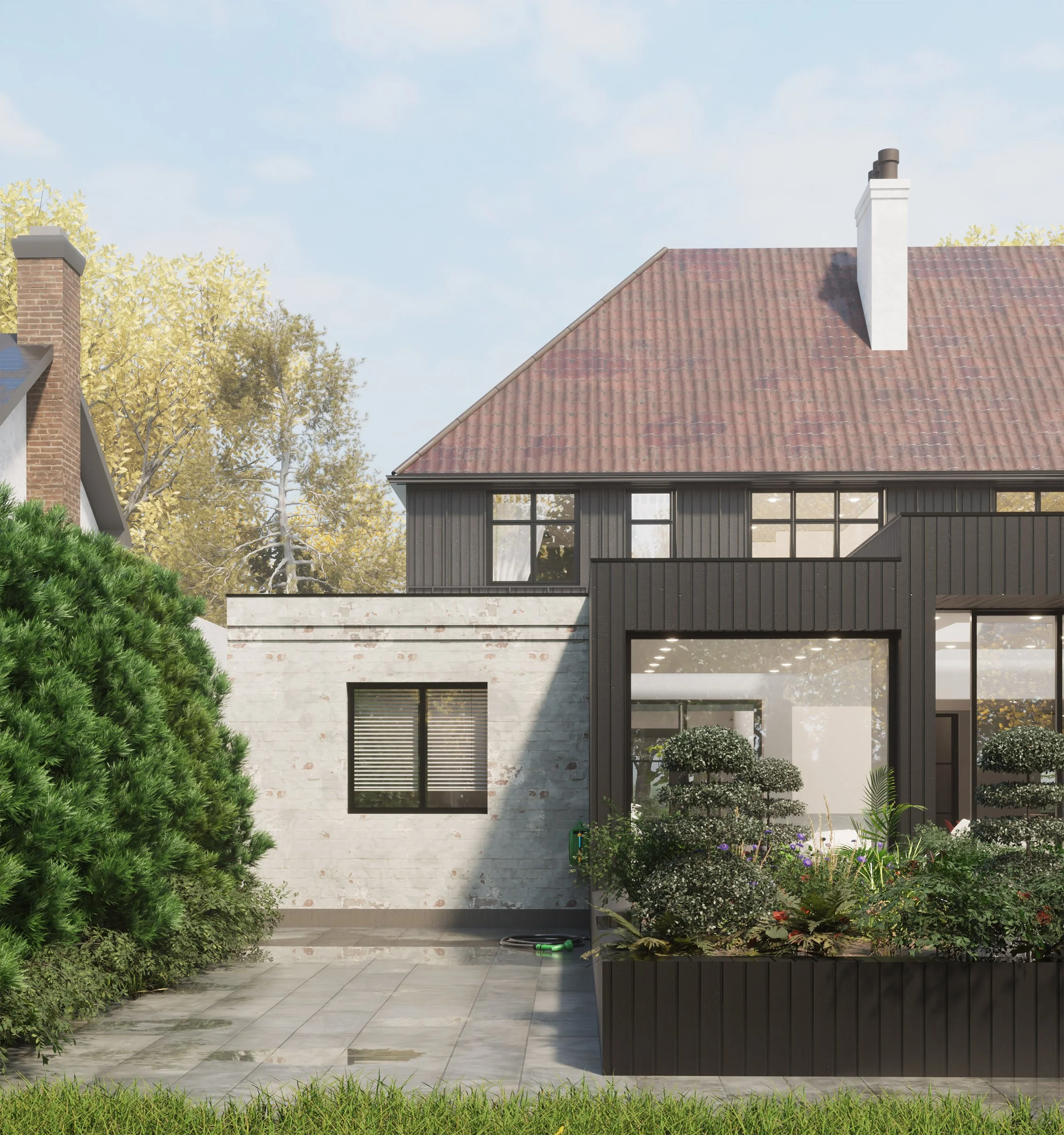 The primary move to increase the volume of the property was to replace the catslide roof at the front elevation with a new hipped gable. We also extended out on both sides, including a partial extension over the existing garage, maintaining the necessary separation from the neighbouring property. This allowed us to create symmetry on the front elevation by centralising the elevation on the protruding front bay windows. The rear ground floor extension and internal reconfiguration allowed us to create a strong line of sight from the main entrance right through to the garden, framing the view and creating a cosy window seat. The massing of the rear extension utilises a subtle play in ceiling height to define and separate the key living areas whilst maintaining its openness.